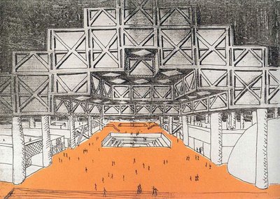 Born and schooled in Budapest, active in Haifa until 1957 and later in Paris, Yona Friedman, like many of his contemporaries, has concentrated on the scale of the city as it has evolved. His proposed ideal architecture is open in character, as this drawing for his Spatial City Project shows. The Spatial City is a unit that can be repeated ad infinitum. All of the structural elements connected to the individual user, such as walls, floor slabs, and partitions, are radically mobile, and the architecture deliberately avoids committing itself to any particular style or pattern of use. Versatile and free as Friedman’s composition is, however, it is contained by a superior order, on which it relies: the wide grid of pillars and slabs on which it stands. Friedman called this grid the "spatial infrastructure," and designed it for collective use. The user’s determination was to play as important a role in it as the architect’s: "Mobile architecture looks for techniques which don’t impose a preconceived plan. . . . It is the user who makes the project with a potential ‘designer’s participation.’" The design of Friedman’s ideal city is only perfected in its use.