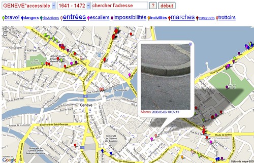 Por eso y por que ahora se encuentra trabajando con Personnes à mobilité réduite à Genève 2008, he vuelto a escribir sobre este proyecto en ADN.es | Ciudades enredadas, Arte colaborativo y denuncia en la ciudad. Estos son algunos de los proyectos que comento en ese post y que describen una fascinante evolución tecnológica (con la aparición de la web 2.0, Google Maps o de los móviles con sistemas de geoposicionamiento y cámaras integradas):