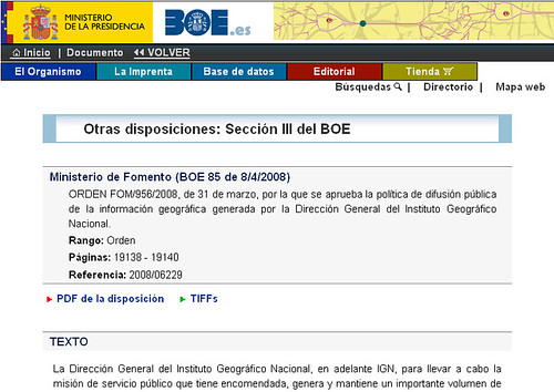 Ministerio de Fomento (BOE 85 de 8/4/2008). ORDEN FOM/956/2008, de 31 de marzo, por la que se aprueba la política de difusión pública de la información geográfica generada por la Dirección General del Instituto Geográfico Nacional.