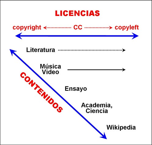 4. Relaciones entre los tipos de contenidos y las licencias. Existe una evidente co-evolución entre la digitalización de los contenidos y el tipo de licencias utilizadas, que he intentado resumir en este esquema: