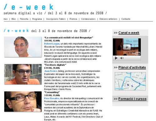 La próxima semana se celebra la e-week, setmana digital a Vic, un evento del máximo interés, por su calidad, intensidad y diversidad, para todos aquellos interesados en la tecnología y la cultura digital. Se iniciaron ya en 2004 y las ediciones anteriores han permitido traer a Vic a algunos de los personajes más interesantes en este ámbito a la vez que mantienen una preocupación por las relaciones entre Internet y el desarrollo local. Este año, como siempre, cuenta con un interesante programa de conferencias, mesas redondas y talleres.