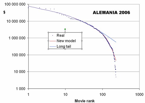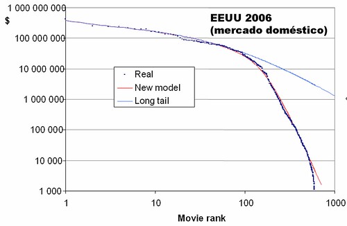Kalevi Kilkki, investigador de Nokia Siemens Networks, publicó en Mayo de 2007 en First Monday (A practical model for analyzing long tails) una metodología estadística para estimar la “larga cola oculta” o potencial y la aplicó a diferentes tópicos como los libros, las frases de búsuqeda o el tamaño de las empresas. Chris Anderson comenta la aplicación de esta metodología al mundo del cine en How big would the movie industry be if there were more screens?. Este post enlaza con una research note de Kalevi Kilkki (en formato doc) donde proporciona más detalles de las largas colas de los mercados cinematográficos. Los datos de producción de películas muestran claramente como la distribución tradicional funciona como un cuello de botella que no limita la oferta (la producción). En otras palabras, existe un enorme número de obras que no llegan a distribuirse; en su mayor parte películas “de nicho” que no resultan rentables en los canales tradicionales pero que si podrían serlo con nuevos modelos de distribución. Los métodos de Kilkki permiten estimar la importancia cuantitativa de esta larga cola: