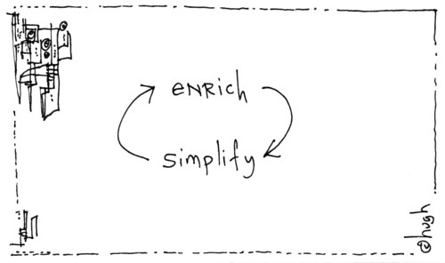 [La incofundible viñeta que acompaña este post fue publicada por Hugh MacLeod en Gapinvoid, y fue utilizada recientemente por Laurent Haug en su reflexión sobre las dificultades que representa escalar un sistema abierto. Un problema social para el que se diseña un servicio es inevitablemehte un sistema abierto y la metodología tiene que pasar por ciclos continuos de enriquecimiento y simplificación de los sucesivos prototipos]