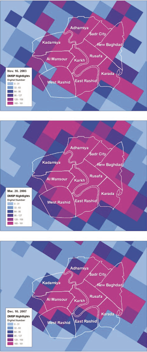 Baghdad ha sido quizás el lugar más afectado, en su degradación de la calidad de vida, por la guerra y la posterior ocupación. Pero el hecho de que los niveles de violencia continuen siendo muy elevados impiden, en la práctica, recoger información sobre el terreno para evaluar el impacto del cambio de estrategia militar. El fundamento de la idea es simple: en caso de que el cambio de estrategia fuese efectivo se debería observar un incremento paulatino de la iluminación nocturna dado que la infraestructura eléctrica debería ir siendo reparada paulatinamente en las diferentes barriadas. De este modo, la intensidad lumínica nocturna nos explicaría como han evolucionado los niveles de violencia, la reconciliación política y las mejoras de la calidad de vida dela población. Además, las diferencias en la intensidad de iluminación entre barrios podrían proporcionar indicadores de la calidad de vida que experimentan los habitantes de las diferentes zonas de Baghdad. Pero, como existen otros factores que podrían afectar a los datos registrados, utilizaron como controles otras ciudades iraquíes con niveles inferiores de violencia (Kirkuk, Mosul, Trikit y Karbala).