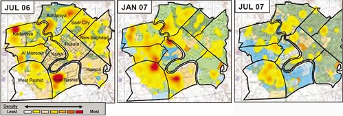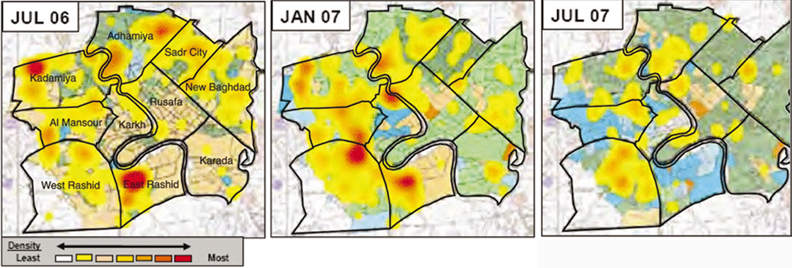 Estos mapas representan la densidad de incidentes violentos en Baghdad en Julio de 2006 y Enero y Julio de 2007. Los colores más cálidos indcian mayor número de conflictos.
