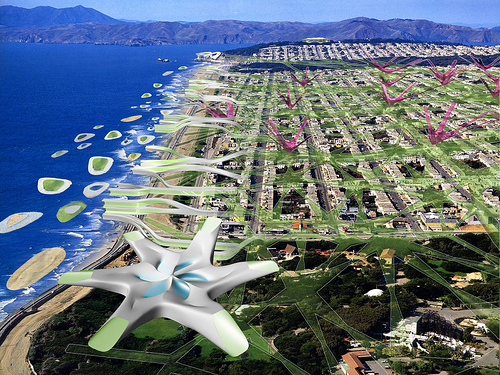 Como ejemplo de una aproximación radicalmente diferente al paisaje artificial, el History Channel convocó el concurso City of the Future: A Design and Engineering Challenge (vía Laughing Squid) donde proponían a los participantes que imaginasen las ciudades de San Francisco, Washington DC y Atlanta en 2108. Participaron 8 equipos en cada ciudad que dispusieron de solo una semana para imaginar como sería la ciudad del fututro, 3 horas para construir sus modelos y solo 15 minutos para presentar su visión a un jurado. El estudio IwamotoScott Architecture fue sido designado ganador para San Francisco con su proyecto SF Hydro-Net, que incluye entre otras naturalezas artificiales champiñones geotérmicos (“Geothermal Mushroom”) o flores de niebla (“Fog Flower”). El proyecto está documentado gráficamente en este album de Flickr.