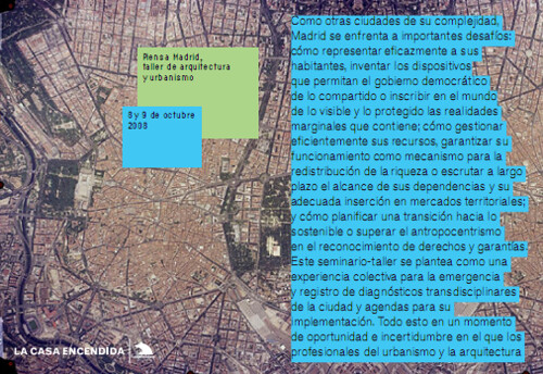 La próxima semana estaré participando en Piensa Madrid: taller de arquitectura y urbanismo, comisariado por Ariadna Cantis y organizado por La Casa Encendida. Combina visitas a espacios urbanos y talleres con sesiones de ponencias sobre Territorio y Sociedad. En conjunto se pretende investigar las “razones” que explican el funcionamiento de una ciudad como Madrid, desde las infraestructuras y los sistemas políticos a las procesos auto-organizados o informales. Y en paralelo, la arquitectura ¿como escenario o como actor?: