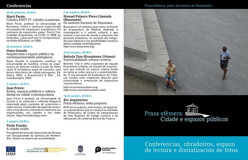 Pontevedra Cultura, el área municipal de cultura del Ayuntamiento de Pontevedra, organiza Praza efémera: Cidade e espazos públicos, una propuesta de intervención y diálogo sobre los espacios urbanos y de recuperación de la memoria de la ciudad (que se puede seguir en su galería de imágenes) que dirige Silvia García González, de la Facultad de Bellas Artes de la Universidad de Vigo en Pontevedra.