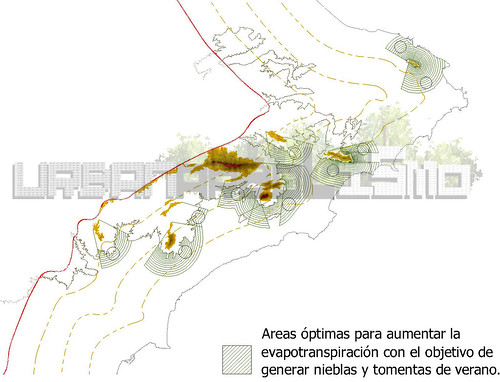 La lógica de este proyecto se basa en la hipótesis de que es posible modificar los procesos ambientales en esta zona costera mediterránea mediante las intervenciones arquitectónicas y reforestación. Así se propone estrategias de urbanización para reforestar el territorio y aumentar las precipitaciones. Para este último objetivo se deberían crear “urbanarbolizaciones” a menos de 20 km del mar y en zonas con montañas de altitudes mayores de 1000 m. Mediante una combinación de reforestación y sistemas de riesgo y depuración se favorecería la evapotranspiración y de este modo se podría aumentar el índice de tormentas convectivas orográficas (que se producen gracias a la combinación de la humedad aportada por el mar y la evaporada por la vegetación situada en el recorrido de la brisa; esta humedad choca contra las montañas y se eleva, condensando y formando las tormentas).