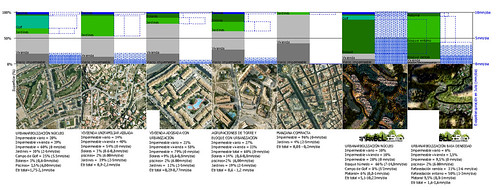 … existen principalmente tres tipos de urbanización: agrupaciones de vivienda unifamiliar aislada, agrupaciones de viviendas adosadas y agrupaciones de alta densidad en torre o bloque con urbanización. En en el siguiente diagrama se puede observar un análisis de las evapotranspiraciones de cada uno de estos tipos de urbanización comparadas con las evaporaciones de una urbanarbolización.