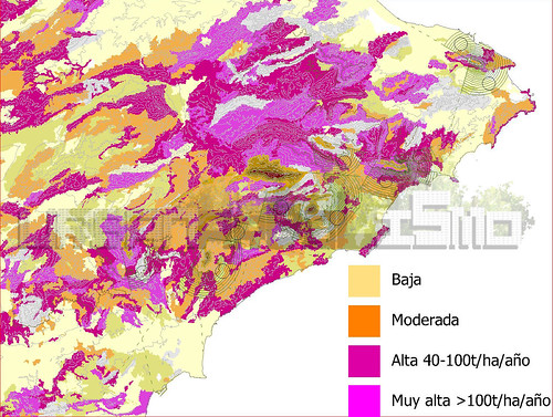El proyecto proporciona una cartografía detallada de la provincia de Alicante donde se incluyen acuíferos, aguas superficiales, núcleos urbanos, contaminación, vegetación, tormentas, espacios naturales, erosión, sistema hidrológico. Este mapa representa, por ejemplo, el potencial de de erosión en la provincia de Alicante:
