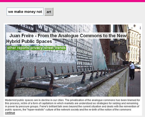 En Noviembre de 2007 tuve la oportunidad de presentar en el Medialab Prado la conferencia Del procomún analógico a los nuevos espacios públicos híbridos (en el post se puede consultar la pesentación y el resumen; video). Entre el público se encontraba Regine Debatty, la responsable del indispensable we make money not art, que me ha sorprendido con un inesperado y fascinante regalo. Ha elaborado un amplio resumen con textos en inglés e imágenes de mi intervención, que puede consultarse en Juan Freire - From the Analogue Commons to the New Hybrid Public Spaces.