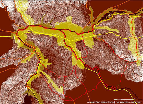 1. El territorio estratégico. Sobre la topografía de la ciudad se representa el sistema ferroviario (línea amarilla), valles fluviales (áreas amarillas), sistema viario metropolitano (rojo)