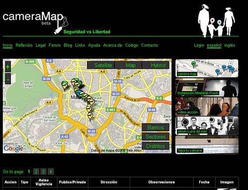 Como explican en su web: “… es un proyecto de reflexión sobre el papel de la seguridad, y más concretamente de la videovigilancia en nuestra sociedad”. El núcleo principal de la iniciativa es una plataforma denominada CameraMap, actualmente en beta, que permite la geolocalización de cámaras de videovigilancia en la ciudad de Madrid. La plataforma es abierta para que cualquier usuario pueda actuar de “sensor humano” detectando cámaras que puede incorporar a la base de datos y a las visualizaciones del sistema. Como los mapas están basados en Google Maps, cualquiera puede iniciar una nueva acción en cualquier otro territorio. De hecho, en estos momentos el proyecto solo cuenta con información de un área limitada del centro de Madrid que demuestra las posibilidades de acción colectiva, pero su objetivo es crecer en el futuro por la participación activa de los usuarios.