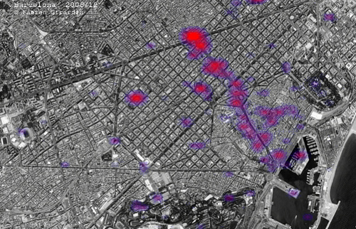 Processing, Google Earth y fotografías públicas georreferenciadas en Flickr (las “huellas digitales”) son los ingredientes básicos para modelizar la densidad de turistas y sus flujos de diferentes ciudades (imprescindible los videos de Barcelona y de Florencia donde se resumen los resultados para 2006).